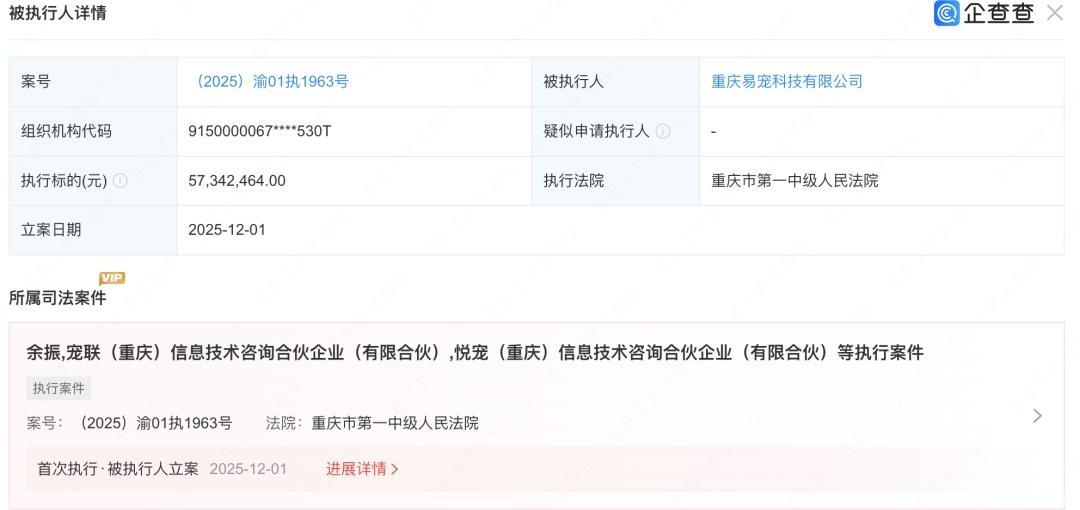 近日,南都湾财社记者从企查查获悉,重庆易宠科技有限公司新增一则被试验信息,试验金额5734万元,同期,公司首创团队肖宇、余振、王刚被列入试验名单,该音信在宠物行业激发烧心。