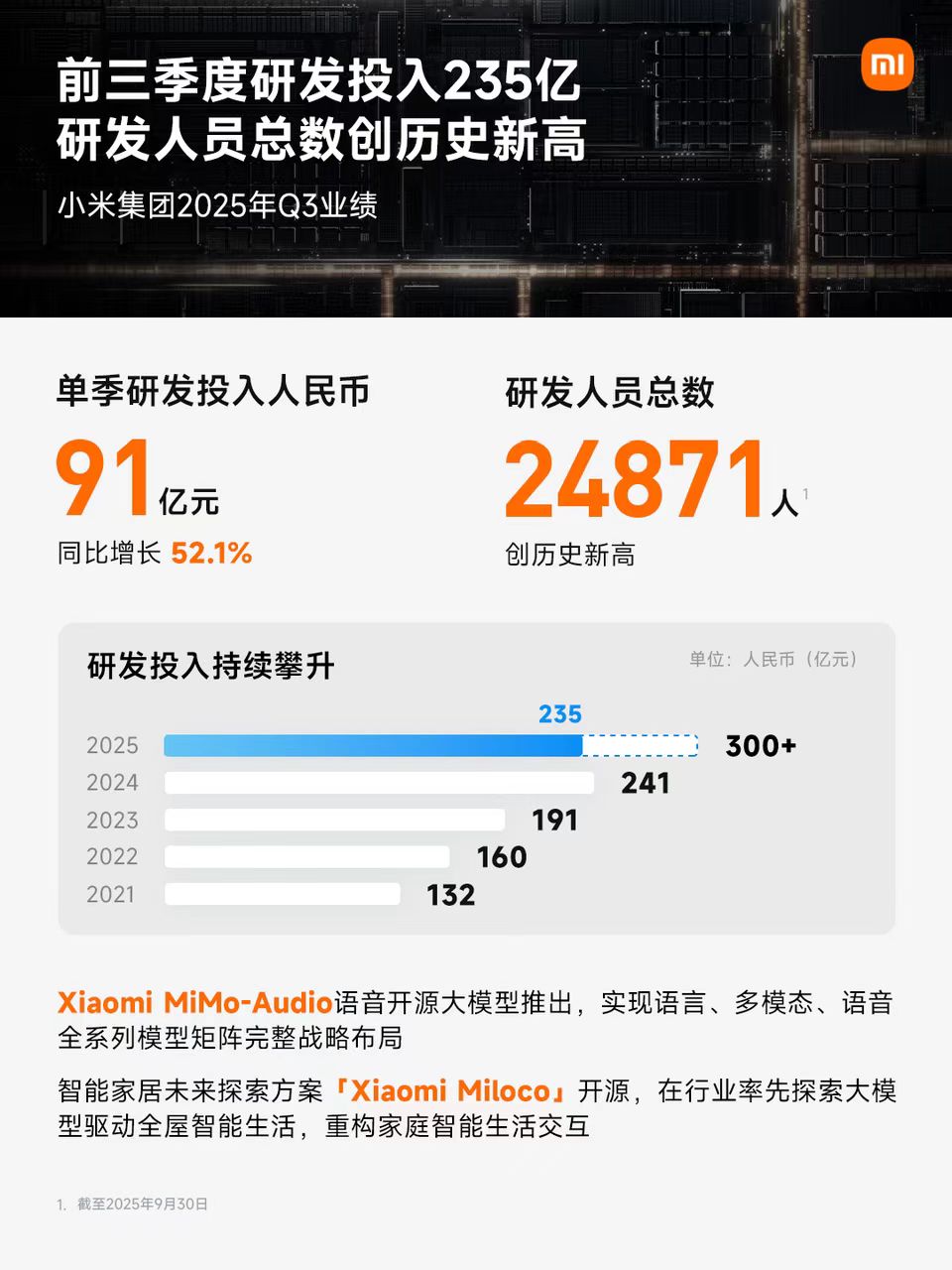 前三季度,小米研发参加累计达235亿元,接近2024年全年研发参加限制,瞻望2025年全年研发参加将超300亿元,本事改换对业务增长的支握作用握续增强。