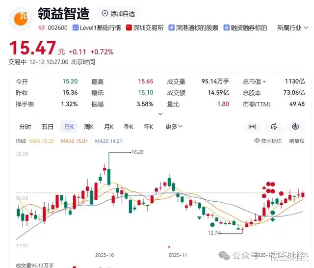 成本商场方面,浪漫发稿前,领益智造A股报收15.47元/股,总市值超1130亿元。