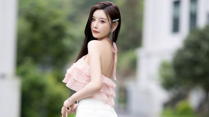 杨晨晨Yome粉色露背上衣检朴白色长裤写照