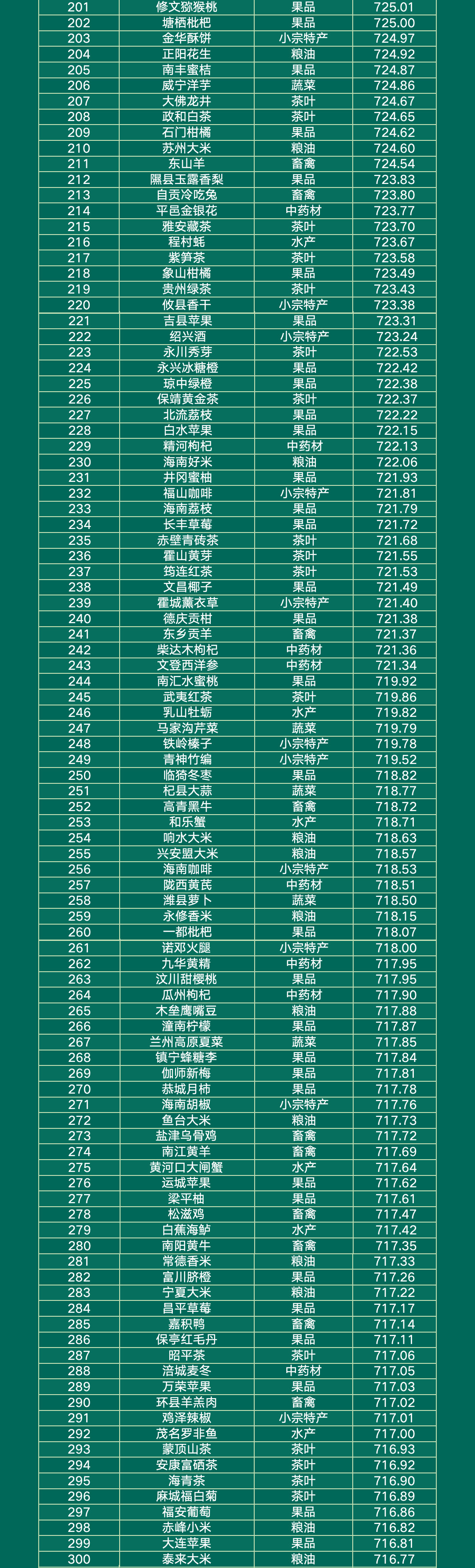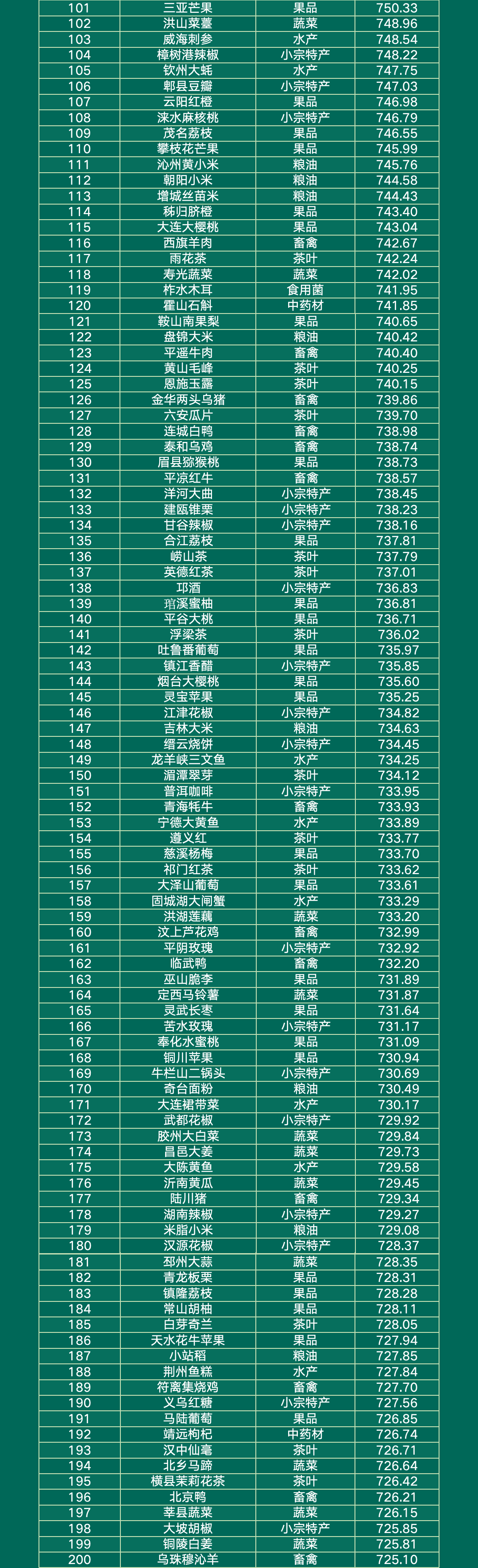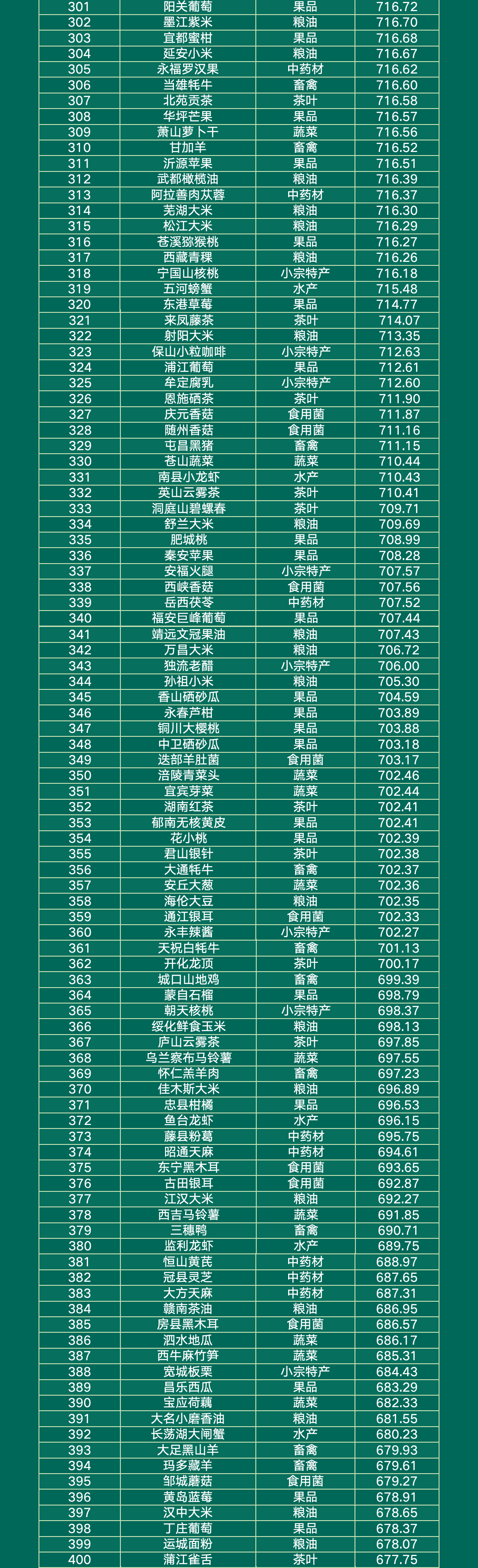粮油类的“五常大米”、茶叶类的“普洱茶”、小宗特产类的“柳州螺蛳粉”、果品类的“烟台苹果”、水产类的“阳澄湖大闸蟹”、蔬菜类的“涪陵榨菜”、畜禽类的“镇巴腊肉”、食用菌类的“柞水木耳”折柳位列各自品类的第一。