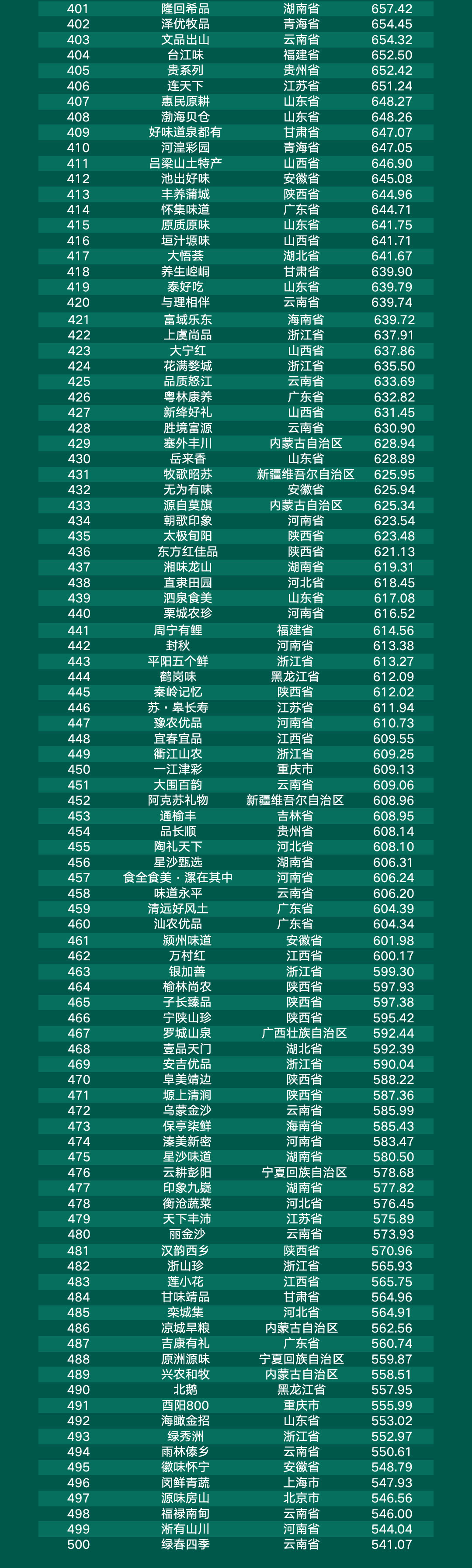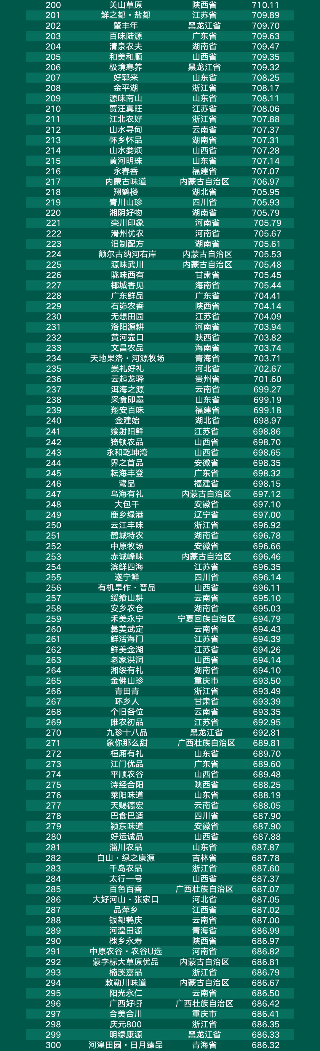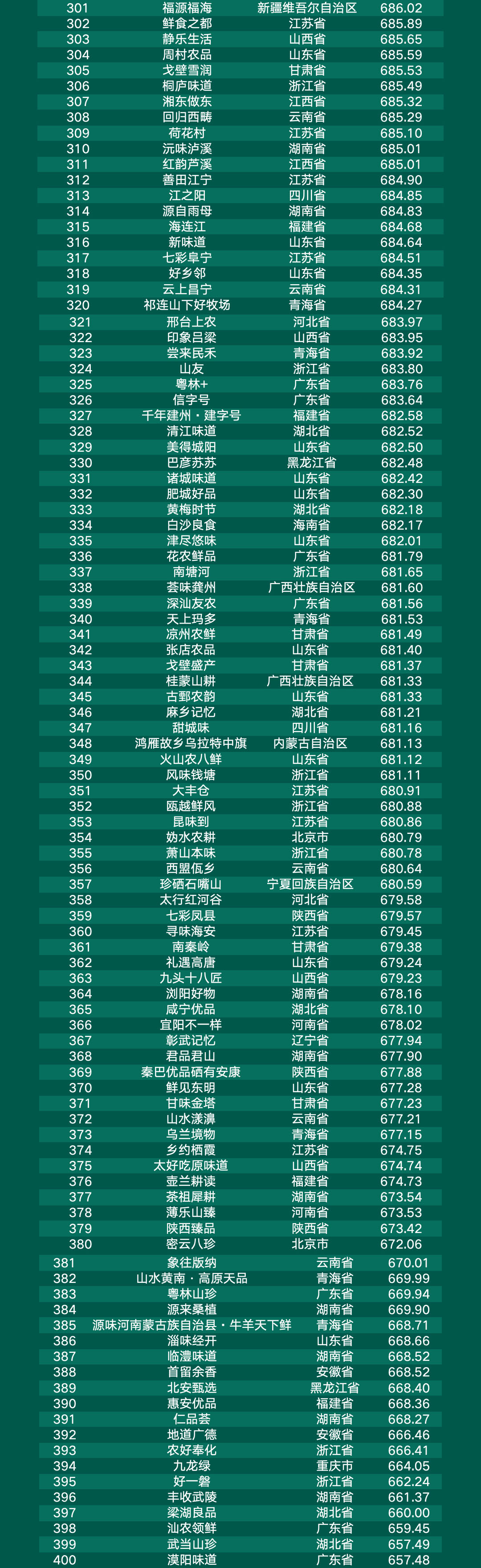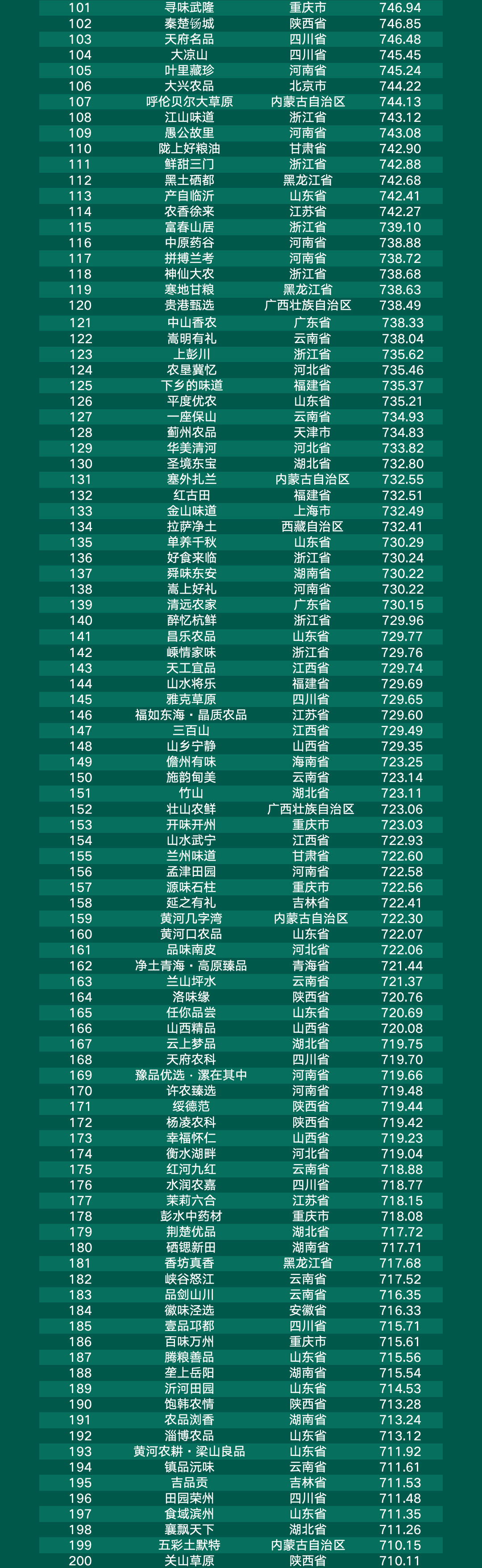 甘肃省“甘味”、山东省“好品山东”、新疆维吾尔自治区“品味新疆”、浙江省“丽水山耕”、江西省“井冈山”位列前五。