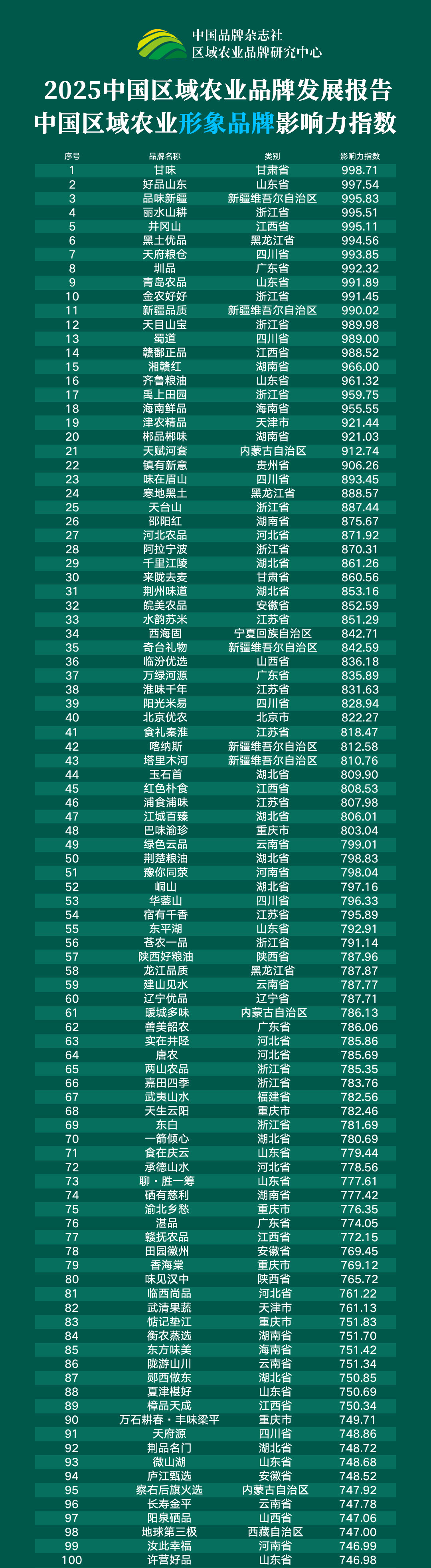 2025中国区域农业品牌发展回报·中国区域农业产业品牌影响力指数